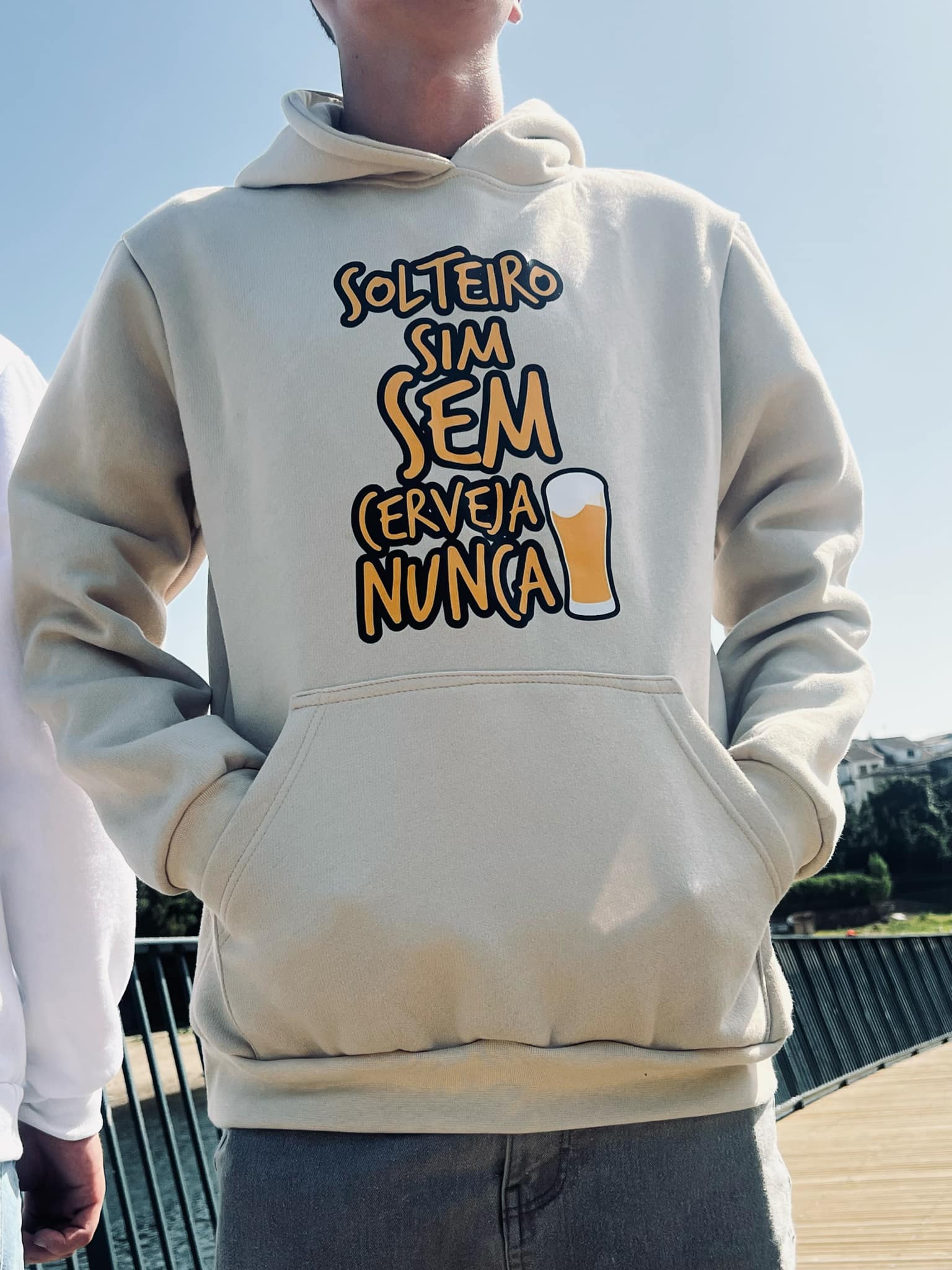 Mostra sua vibe com a hoodie bege estampada com a frase “Solteiro sim, sem cerveja nunca”. Perfeita para quem gosta de conforto e quer expressar a sua personalidade de forma divertida e autêntica.